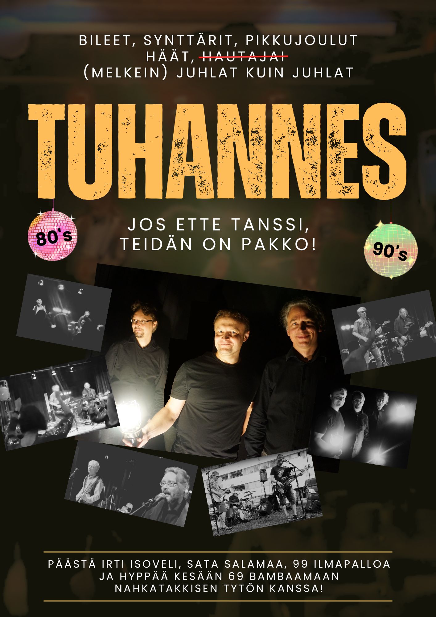 Tuhannes seisoo terveempi jalka tanakasti 80-luvulla. Toinen jalka tekee harhatanssiaskelia naapurivuosikymmenien tuhdeimpien hittien tontille. Nuorisomusiikki jätetään suosiolla niille, jotka osaavat viesteissään käyttää muutakin kuin peukku-emojia. Tuhannes huolehtii mieluummin, että rappiolla olevaan autiotaloon iskee lauantai-iltana sata salamaa ja 99 ilmapalloa räjähtää - oltiin sitten firmapippaloissa, pikkujouluissa, synttäreillä tai häissä.
